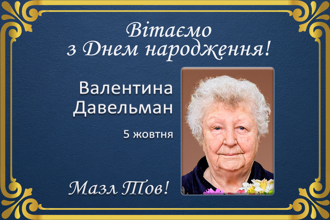 Єврейська громада вітає Валентину Давельман з поважним ювілеєм! Бажаємо залишатися доброю, життєрадісною, щирою, щасливою людиною. Зичимо міцного здоров’я, успіхів, і нехай будуть завжди щастя і радість у її оселі.