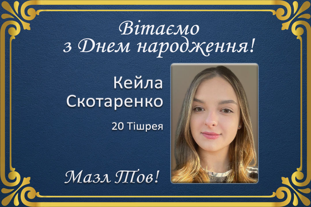 Єврейська громада Кам’янського вітає Кейлу Скотаренко з Днем народження і бажає їй багато радості, удачі, здоров’я, і нехай прийде вона до Тори, Хупи та добрих справ!