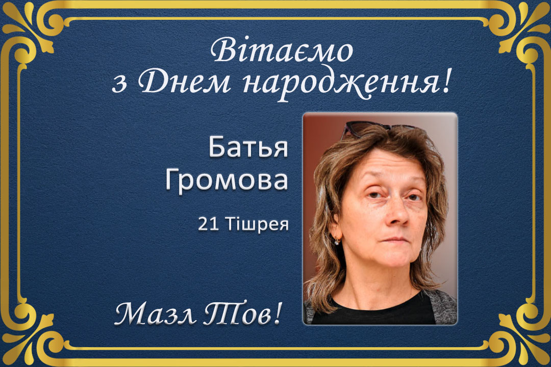 Єврейська громада вітає Батью Громову із Днем народження! Бажаємо міцного здоров’я, успіхів, і нехай будуть завжди щастя і радість у її оселі.