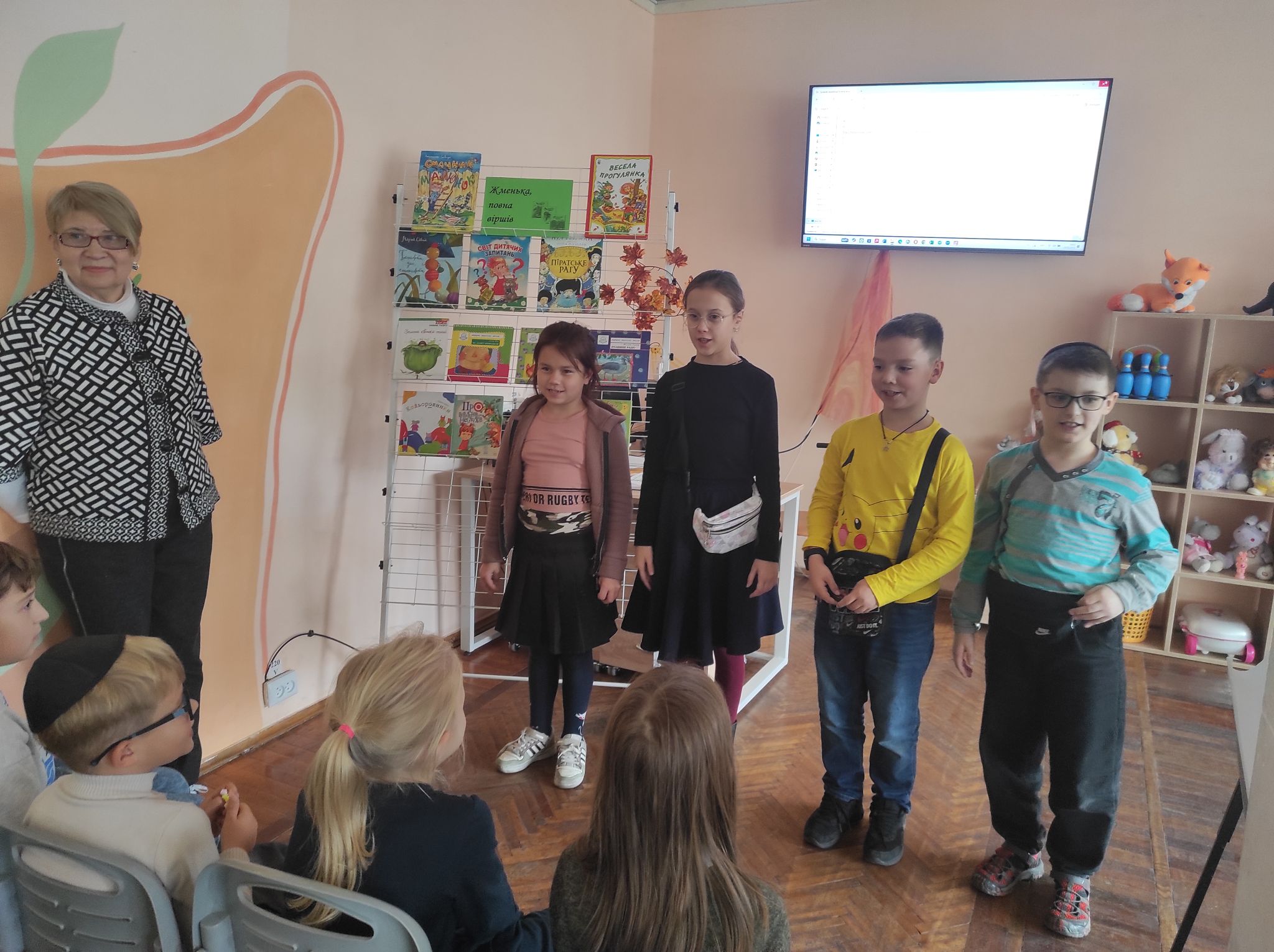 Екскурсія абонементом та читальним залом, бібліографічний огляд біля книжкової виставки “Жменька, повна віршів”, загадки та казки українських письменників, декламація віршів самими дітьми зробили зустріч з книгою та бібліотекою веселою та пам’ятною.
