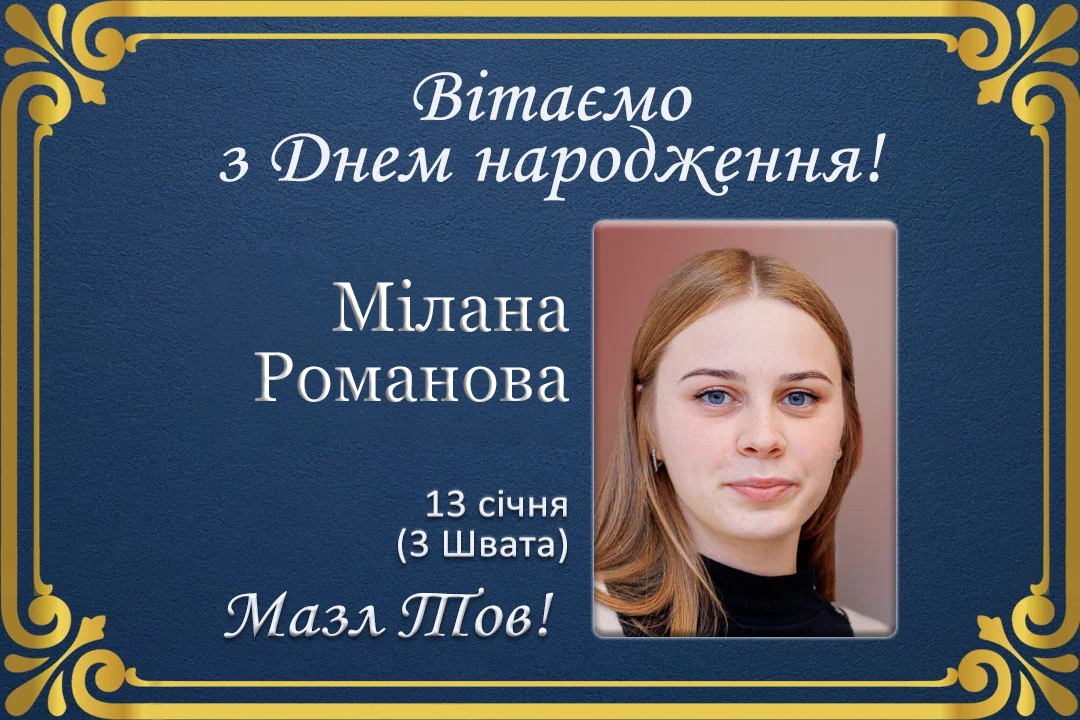Єврейська громада вітає Мілану Романову із Днем народження! Бажаємо міцного здоров’я, успіхів, і нехай будуть завжди щастя і радість у її оселі.