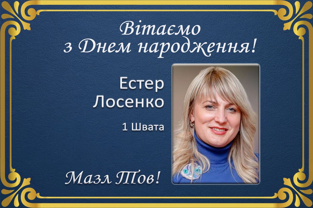 Єврейська громада вітає Естер Лосенко із Днем народження! Бажаємо міцного здоров’я, успіхів, і нехай будуть завжди щастя і радість у її оселі.